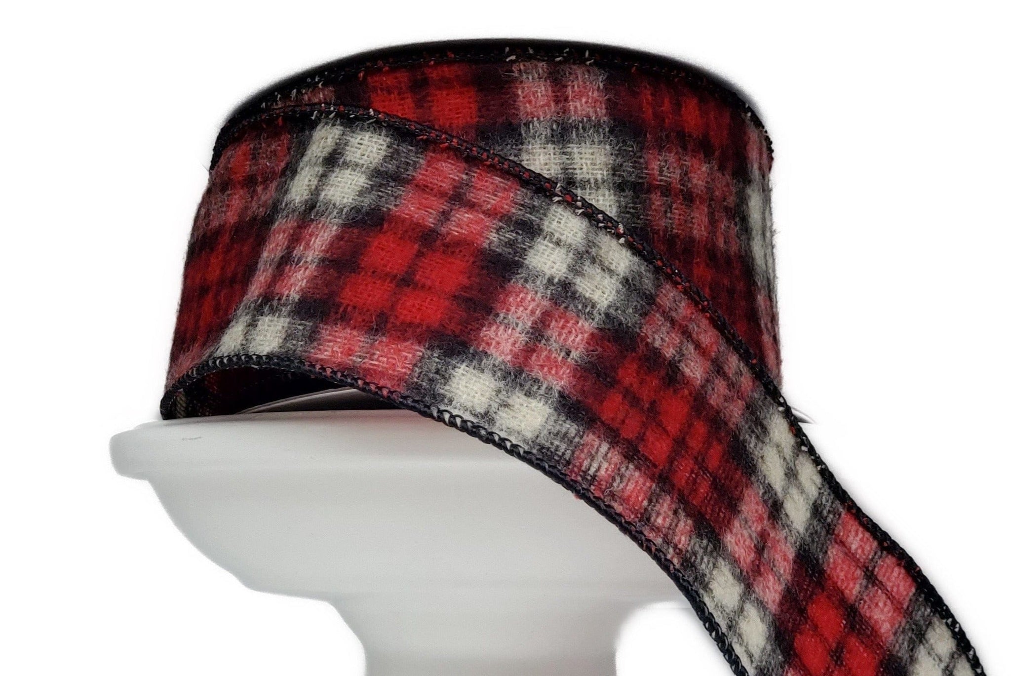 2.5" x 10 yds Plaid Fuzzy Christmas Ribbon, Red, Cream & Black Flannel Ribbon, Wired Christmas Ribbon