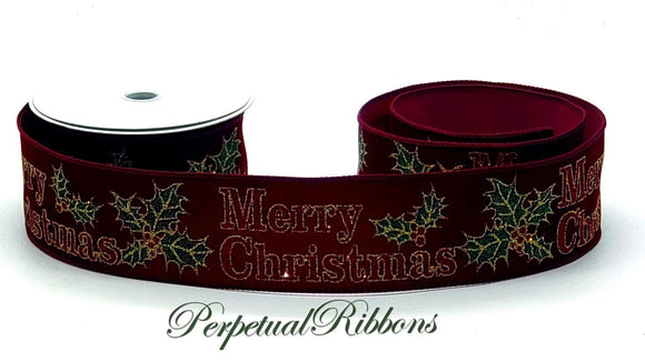 2.5 inch Gorgeous Crushed Burgundy Velvet with Glitter "Merry Christmas" - 10 Yards