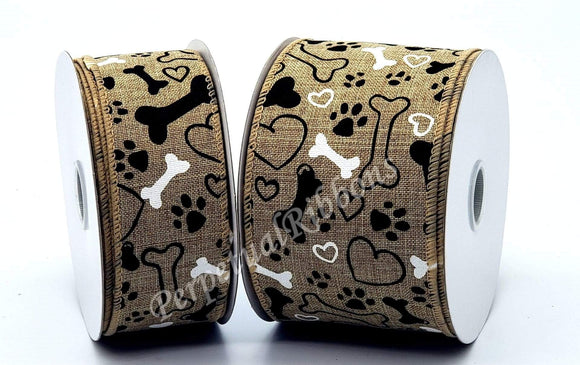 1.5" or 2.5" x 50 Yds Puppy Paws, Hearts & Bones on Natural Canvas Ribbon