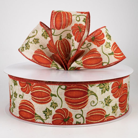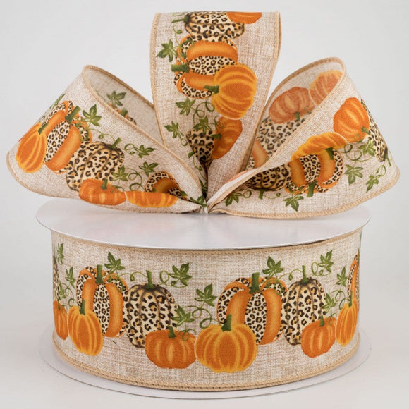 Leopard Type Orange Pumpkins on Natural 2.5" Ribbon - 50 Yards