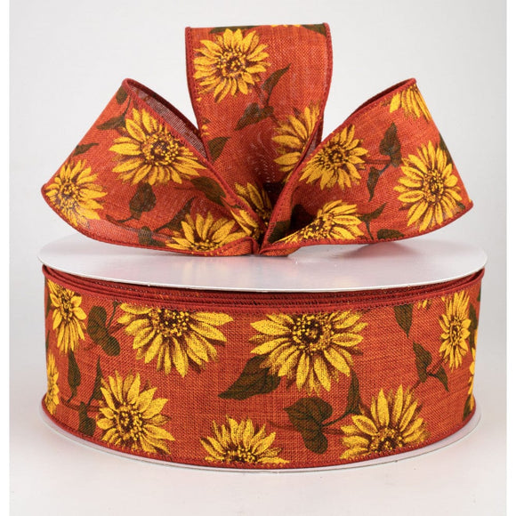 Autumn Sunflower Ribbon - 2.5" Fall Sunflowers on Rust Canvas - 50 Yards