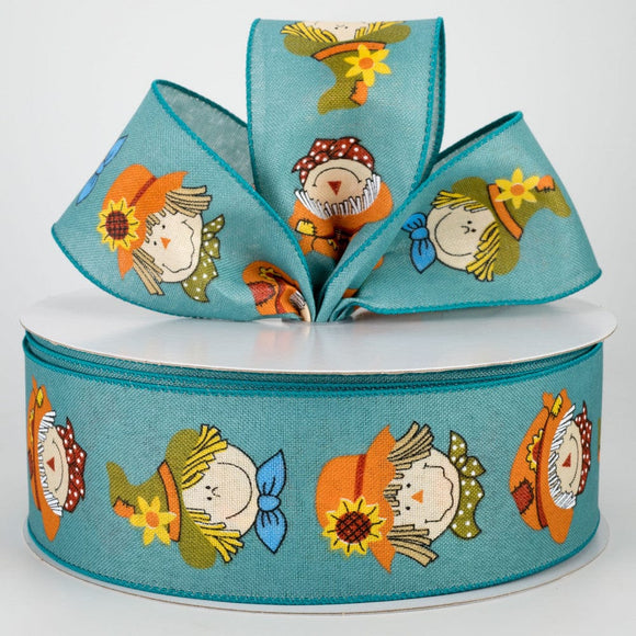 2.5" Teal Canvas Ribbon with Cute Scarecrow Heads - Autumn Ribbon - 50 Yards