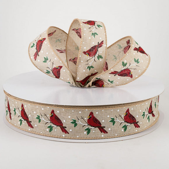 1.5" Natural Ribbon with Sparkling Red Cardinals - Christmas Ribbon - 50 Yards
