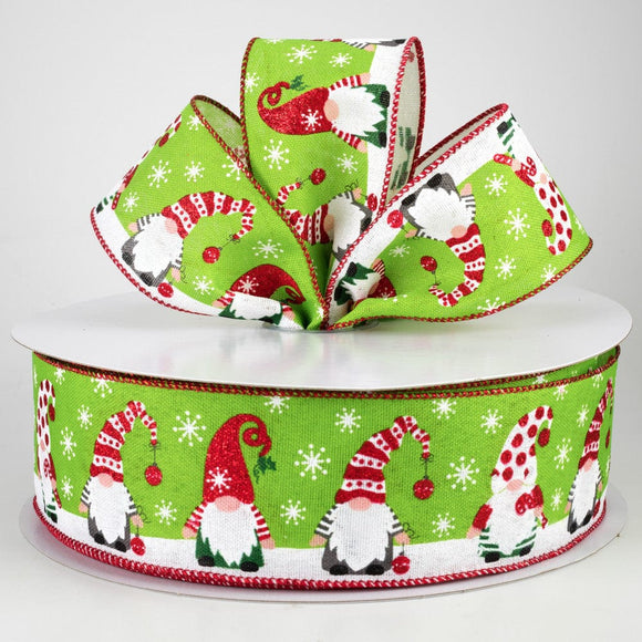 2.5" x 50 yds Lime Green Ribbon featuring Christmas Gnomes, Wired Christmas Ribbon