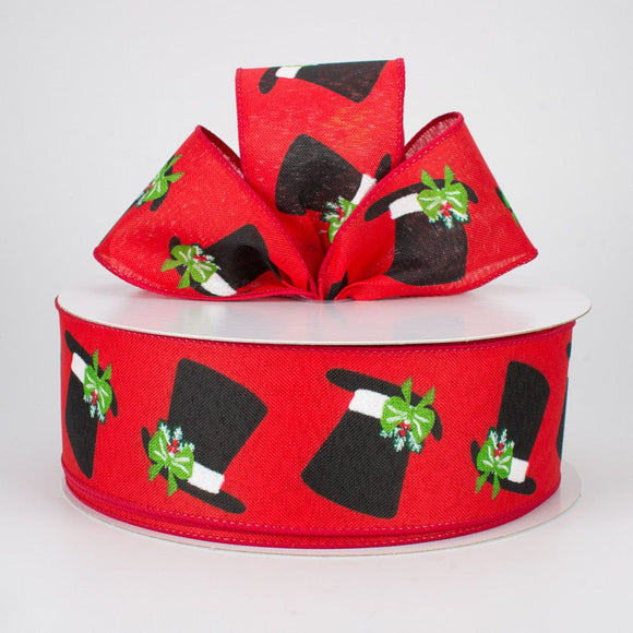 2.5" Red Linen Ribbon with Snowman Top Hats - Christmas Ribbon - 50 Yards