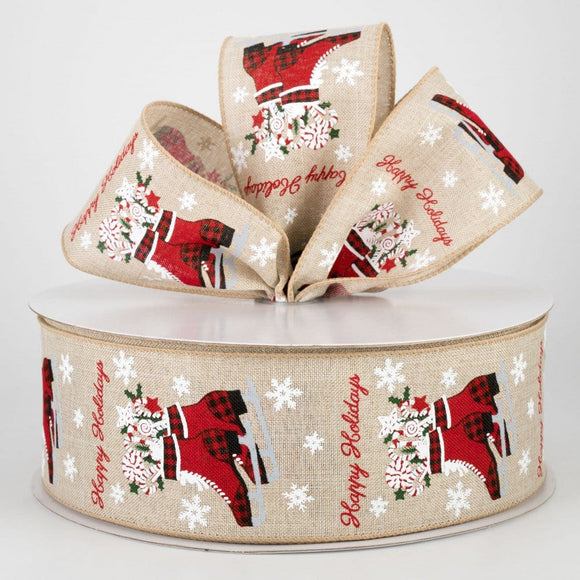2.5 inch Wired Christmas Ribbon - Red & Black Buffalo Check Ice Skates with Candy on Light Natural Canvas Ribbon - 50 Yards