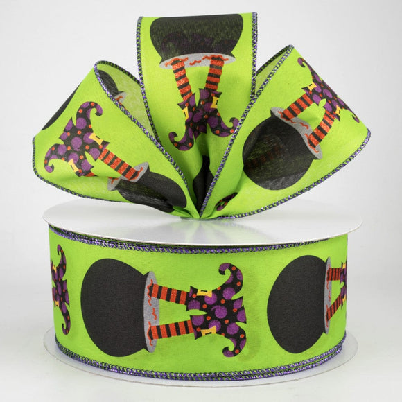 2.5" X 50 yds Lime Green Satin Ribbon with Black Cauldron, Witch Butt & Legs, Wired Halloween Ribbon