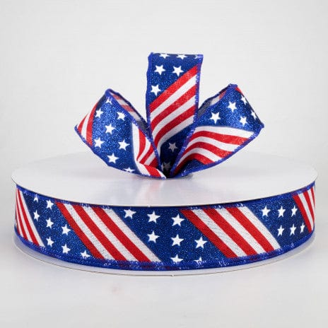 1.5 inch Wired Patriotic Ribbon - Red, White & Blue Diagonal Striped Stars and Stripes Canvas Ribbon - 50 Yards