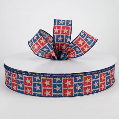 50 Yards 1.5 inch Dark Natural Stars in Red & Blue Squares