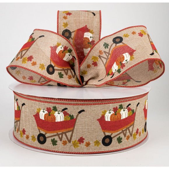 2.5 inch Red Wheel Barrow Carrying Pumpkins on Natural Linen Ribbon - 50 Yards