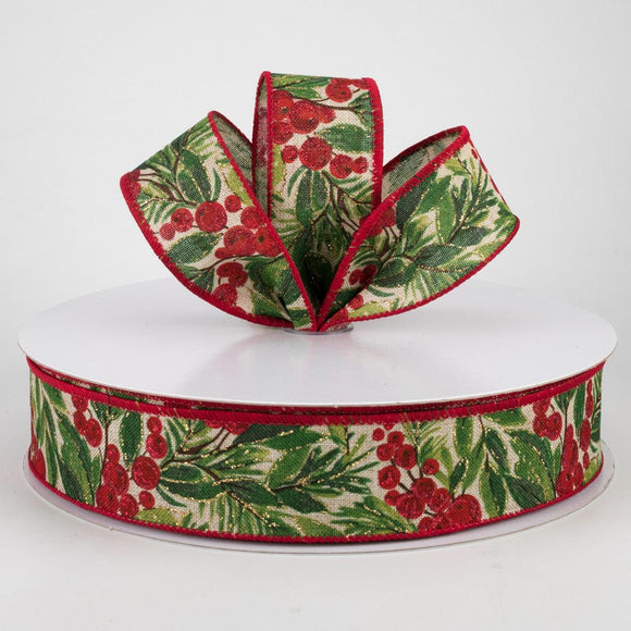 1.5" x 50 yds Holly Berries & Leaves on Natural Canvas Ribbon, Wired Christmas Ribbon