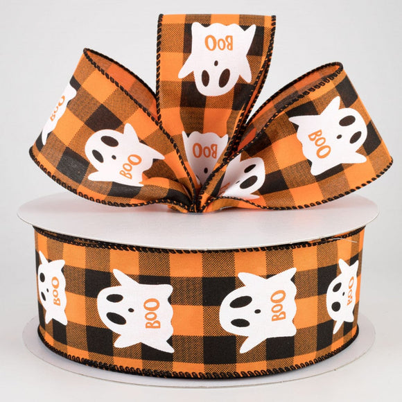 50 Yards 2.5" "Ghosted" Orange & Black Buffalo Check Ribbon - Wired Halloween Ribbon