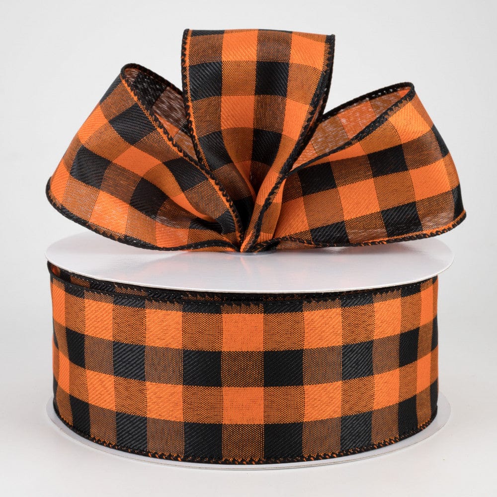 1.5 or 2.5" Orange & Black Buffalo Check Wired Ribbon. The black threaded wired edges will help you create perfect bows that will maintain their shape. This is extremely popular ribbon during Halloween as it can be used in lots of different ways.