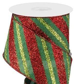 2.5" Green Canvas Ribbon with Diagonal Red & Gold Glittered Stripes.