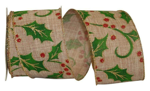 2.5 inch Natural Linen With Holly Leaves & Berries - 5 yards