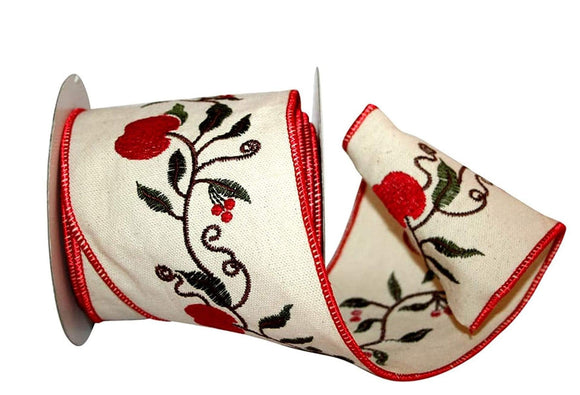5 Yards 4" Cream Canvas Ribbon with Embroidered Red Apples & Berries on Green Vines