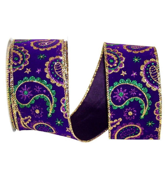 Wired Velvet Mardi Gras Ribbon - 2.5" Purple Velvet Paisley (Purple, Gold & Green Glitter) Pattern - 10 Yards