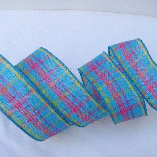 1.5" Turquoise, Hot Pink, Yellow & Lime plaid ribbon. The turquoise threaded wired edges will help you create perfect bows that will maintain their shape.