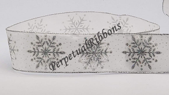 2.5 inch White Satin Ribbon with Three Variations of Silver Glitter Snowflakes - 5 Yards