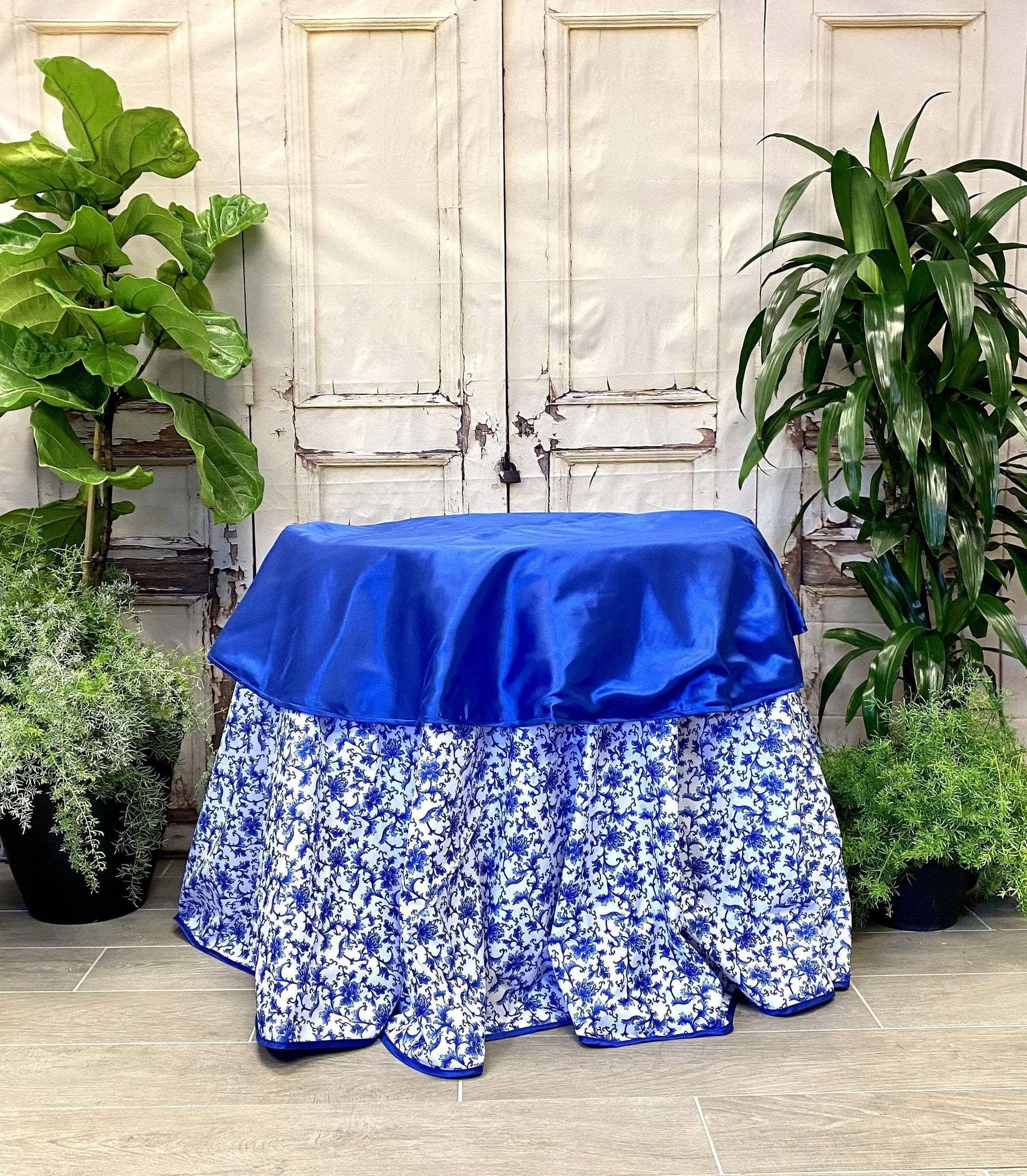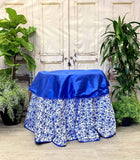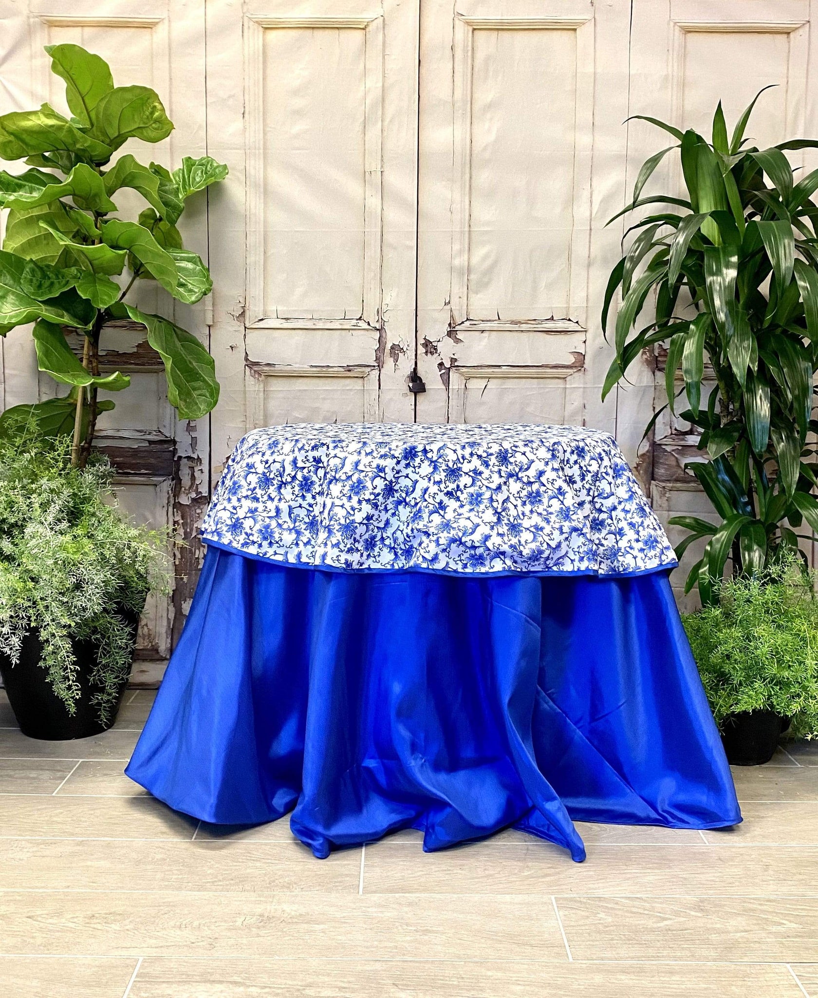 As the pictures show, it's actually a reversible table cloth; Cobalt Blue on one side & Chinoiserie on the other.