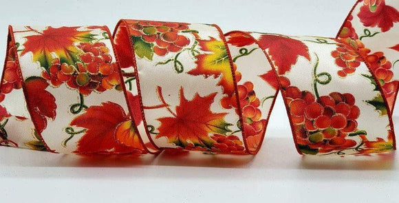2.5" Cream Satin Ribbon with Glittered Grape Clusters & Leaves. Perfect for your Autumn / Fall Crafts or Home Decor Needs. The burnt orange threaded wired edges will help you make perfect bows that will maintain their shape.