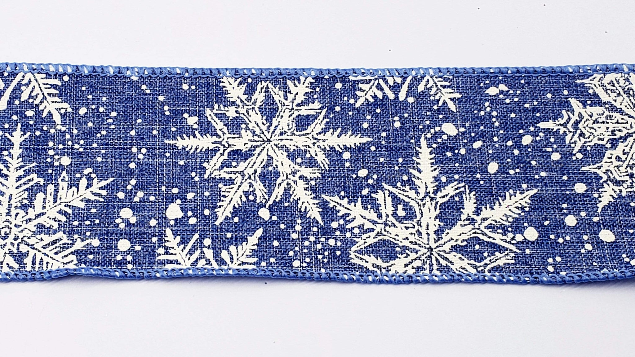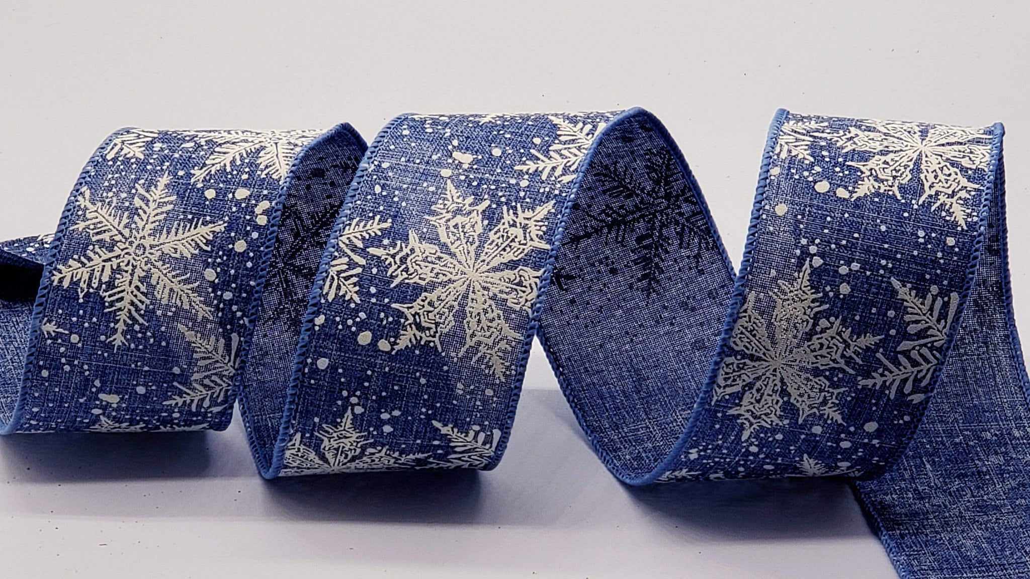 2.5" Denim Canvas Ribbon with Falling White Glittered Snowflakes.