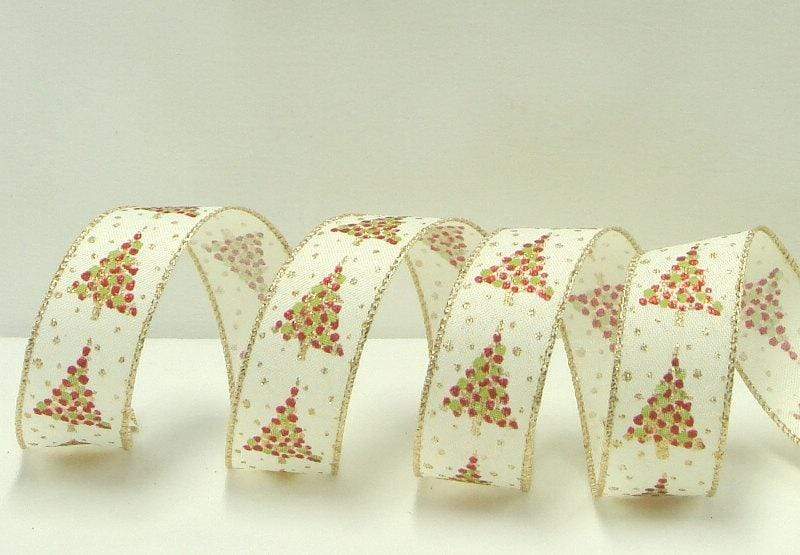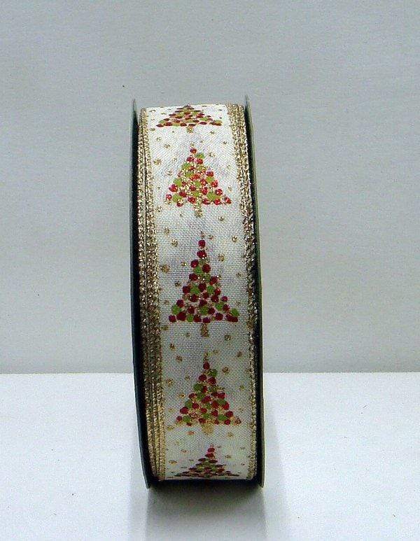 5 Yards of 1.5" Cream Ribbon Featuring Lime Green Christmas Trees decorated with Red Glittered Ornaments and surrounded by Gold Glittered dots, finished with Metallic Gold threaded Wired Edges.